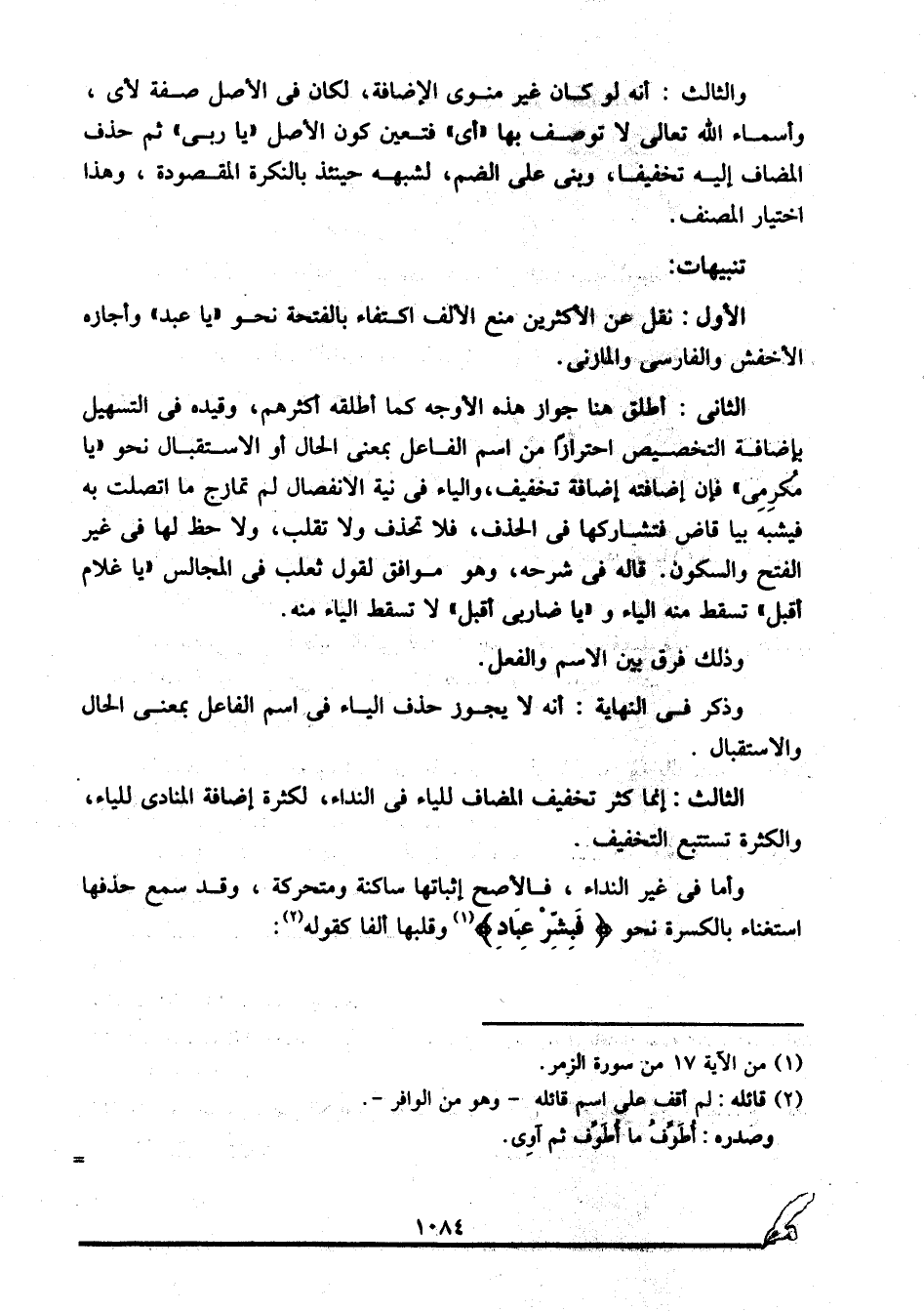 وأما في غير النداء، فالأصح إثباتها ساكنة ومتحركة، وقد سمع حذفها استغناء بالكسرة نحو: {فَبَشِّرْ عِبَادِ} 1 وقلبها ألفا كقوله2: