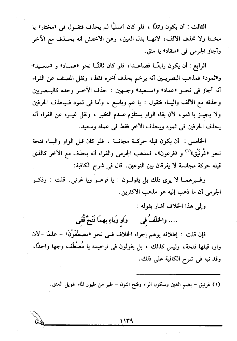 الخامس: أن يكون قبله حركة مجانسة، فلو كان قبل الواو والياء فتحة نحو: "غُرنَيْق"1 و"فرعون"، فمذهب الجرمي والفراء أنه يحذف مع الآخر كالذي قبله حركة مجانسة لا يفرقان بين النوعين. قال في شرح الكافية: وغيرهما لا يرى ذلك بل يقولون: يا فرعو، ويا غرني. قلت: وذكر الجرمي أن ما ذهب إليه هو مذهب الأكثرين.