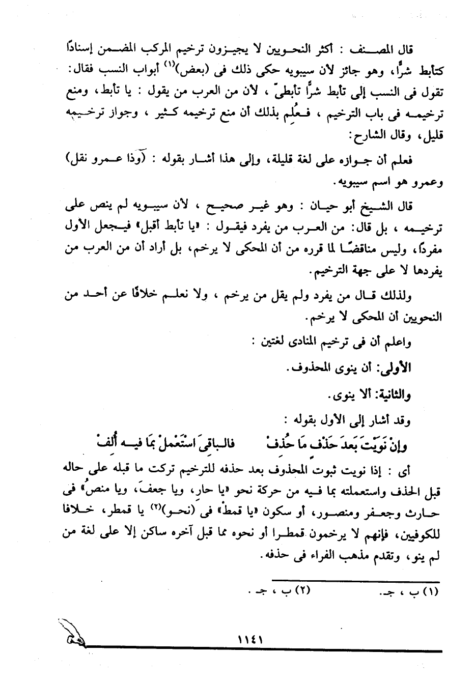 قال الشيخ أبو حيان: وهوغير صحيح؛ لأن سيبويه لم ينص على ترخيمه، بل قال: من العرب من يفرد فيقول: "تأبط أقبل" فيجعل الأول مفردا، وليس مناقضا لما قرره من أن المحكي لا يرخم، بل أراد أن من العرب من يفردها لا على جهة الترخيم.