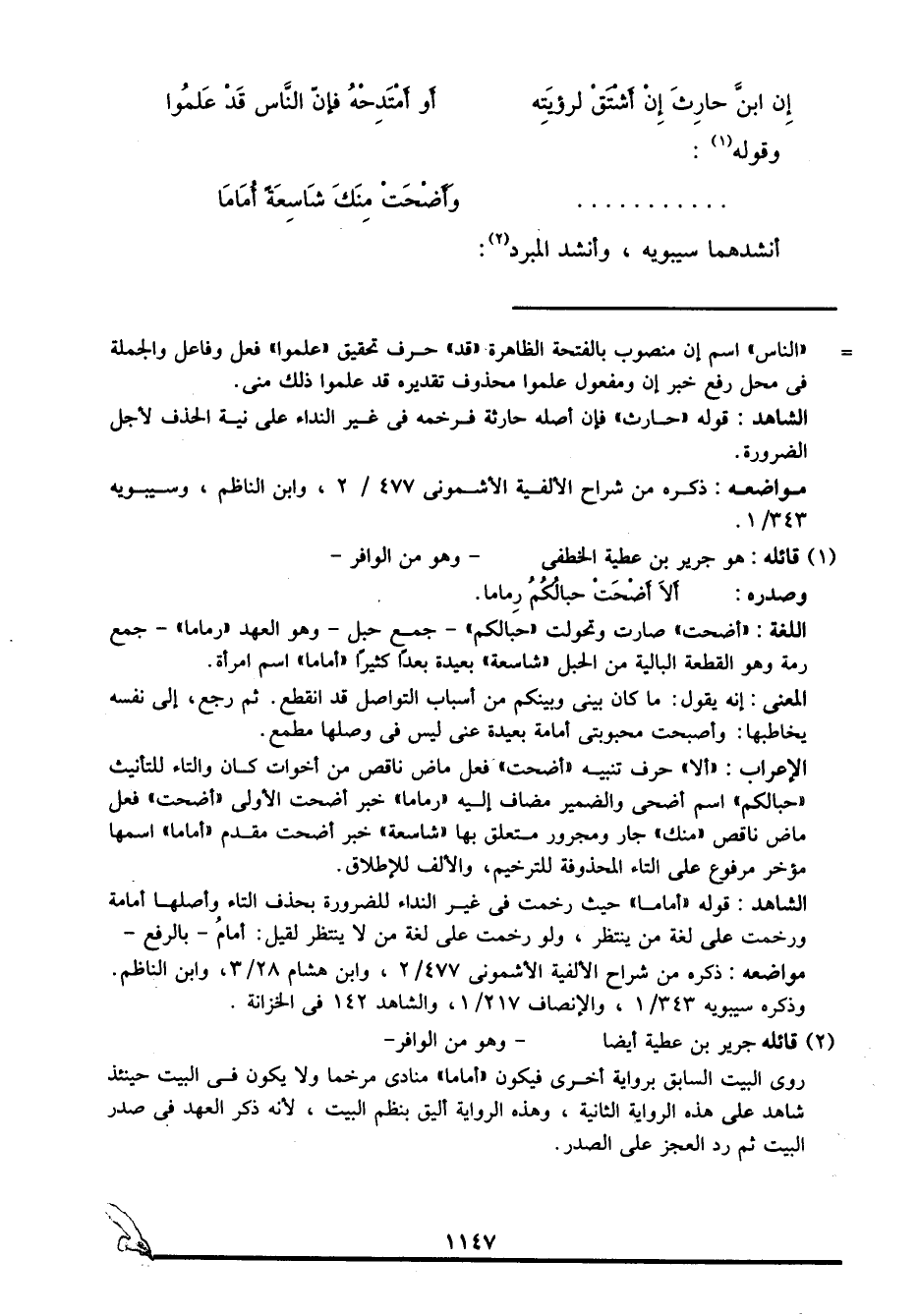 روي البيت السابق برواية أخرى فيكون "أماما" منادى مرخما ولا يكون في البيت حينئذ شاهد على هذه الرواية الثانية، وهذه الرواية أليق بنظم البيت؛ لأنه ذكر العهد في صدر البيت ثم رد العجز على الصدر.