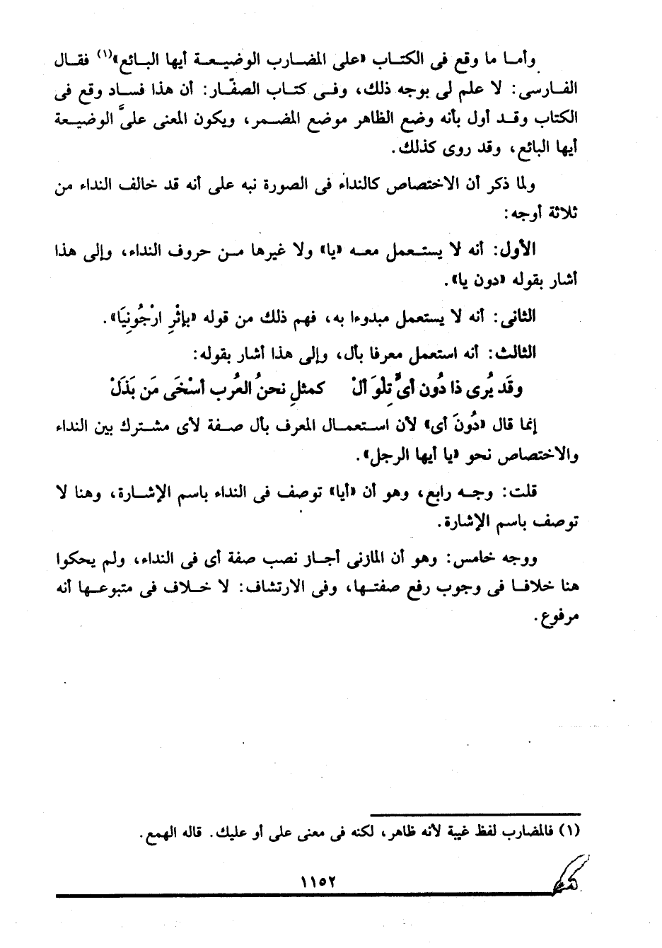 وأما ما وقع في الكتاب "على المضارب الوضيعة أيها البائع"1 فقال الفارسي: لا علم لي بوجه ذلك، وفي كتاب الصفَّار: أن هذا فساد وقع في الكتاب وقد أول بأنه وضع الظاهر موضع المضمر، ويكون المعنى: عليَّ الوضيعة أيها البائع، وقد روي كذلك.