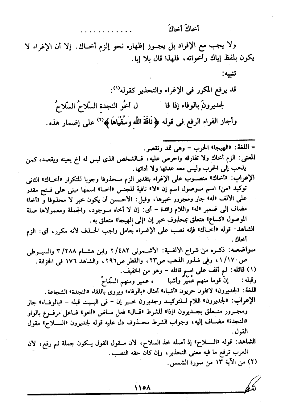 الإعراب: "أخاك" منصوب على الإغراء بتقدير الزم محذوفا وجوبا للتكرار "أخاك" الثاني توكيد "من" اسم موصول اسم إن "لا" نافية للجنس "أخا" اسمها مبني على فتح مقدر على الألف "له "جار ومجرور خبرها، وقيل: الأحسن أن يكون خبر لا محذوفا و"أخا" مضاف إلى ضمير "له" واللام زائدة، أي: إن لا أخاه موجود، والجملة ومعمولاها صلة الموصول "كساع" متعلق بمحذوف خبر إن "إلى الهيجا" متعلق به.