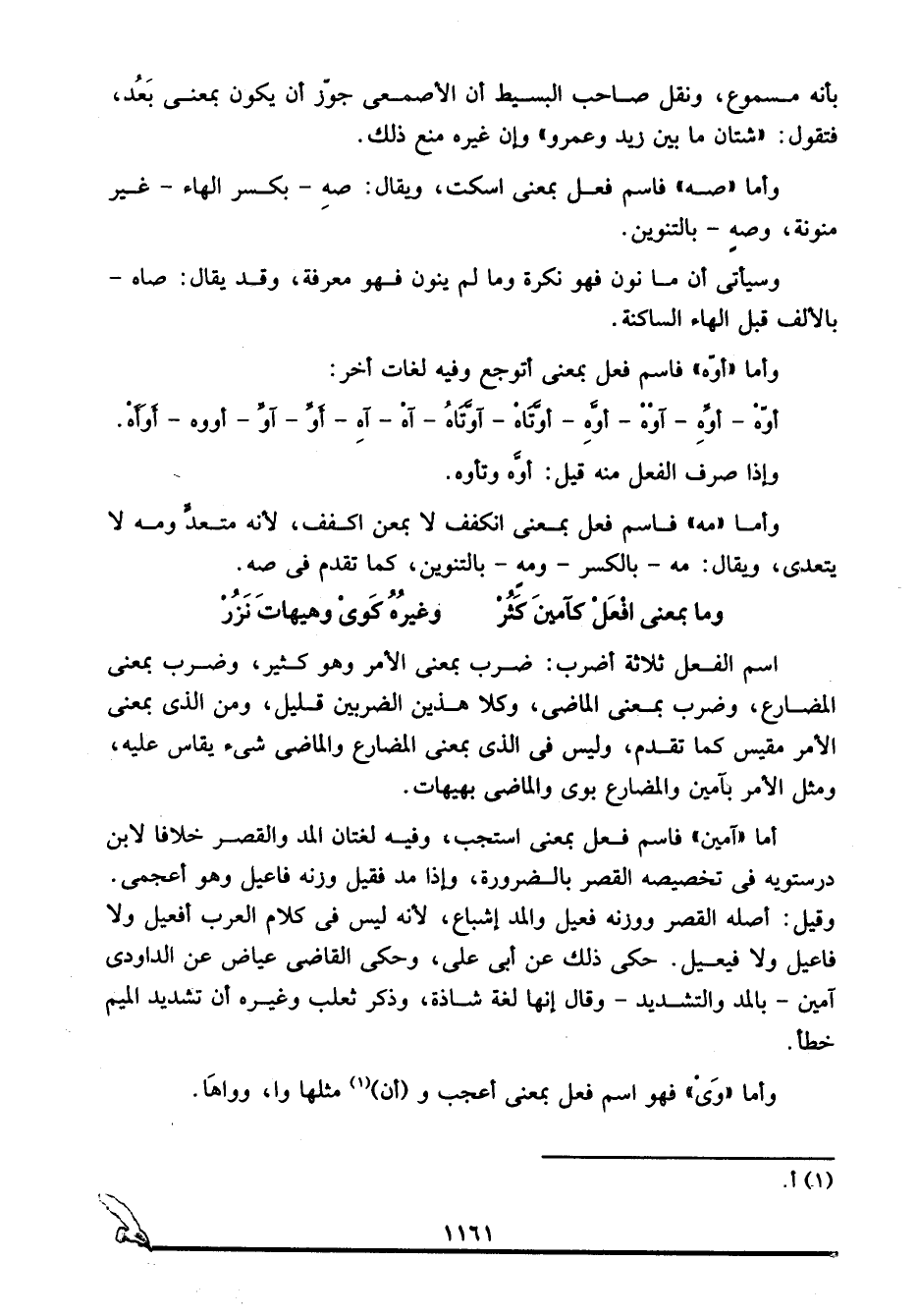 اسم الفعل ثلاثة أضرب: ضرب بمعنى الأمر وهو كثير، وضرب بمعنى المضارع، وضرب بمعنى الماضي، وكلا هذين الضربين قليل، ومن الذي بمعنى الأمر مقيس كما تقدم، وليس في الذي بمعنى المضارع والماضي شيء يقاس عليه، ومثل الأمر بآمين والمضارع بوي والماضي بهيهات.