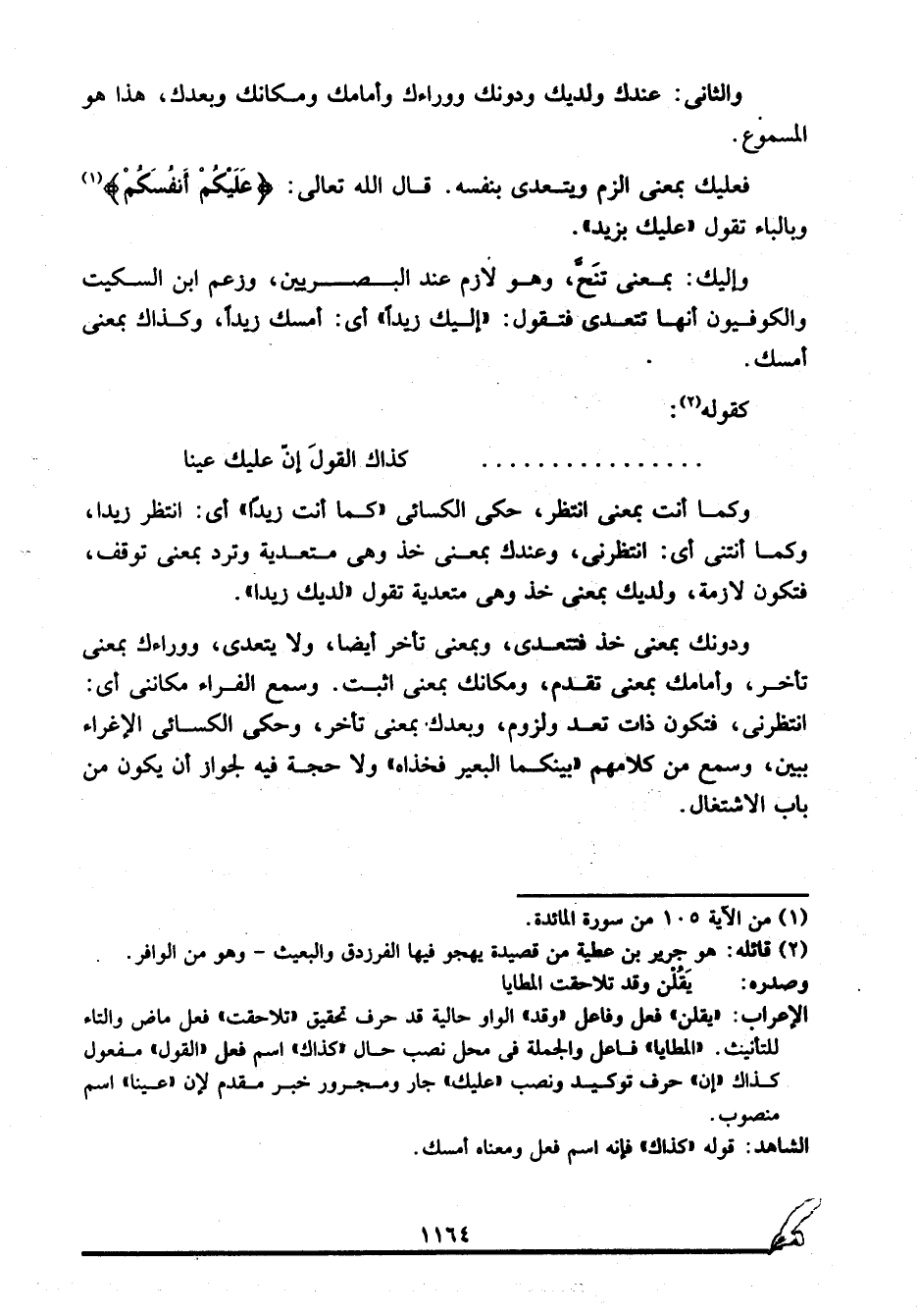 وإليك بمعنى تَنَحَّ، وهو لازم عند البصرين، وزعم ابن السكيت والكوفيون أنها تتعدى فتقول: "إليك زيدا" أي: أمسك زيدا، وكذاك بمعنى أمسك.