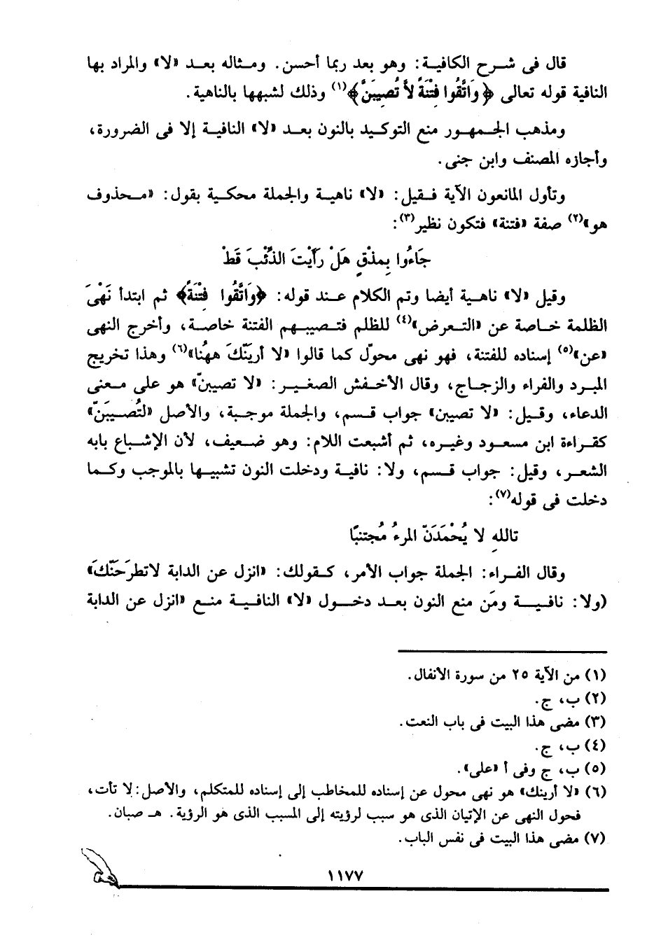 وتأول المانعون الآية فقيل: "لا" ناهية والجملة محكية بقول: "محذوف هو"2 صفة "فتنة" فتكون نظير3: