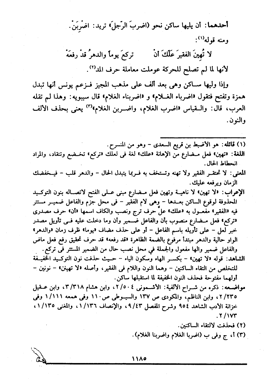 الشاهد: قوله: "لا تهين" -بكسر الهاء وسكون الياء- حيث حذفت نون التوكيد الخفيفة للتخلص من التقاء الساكنين، وهما النون واللام في الفقير، وأصله "لا تهينن" -نونين- أولهما مفتوحة فحذف النون الخفيفة لما استقبلها ساكن.