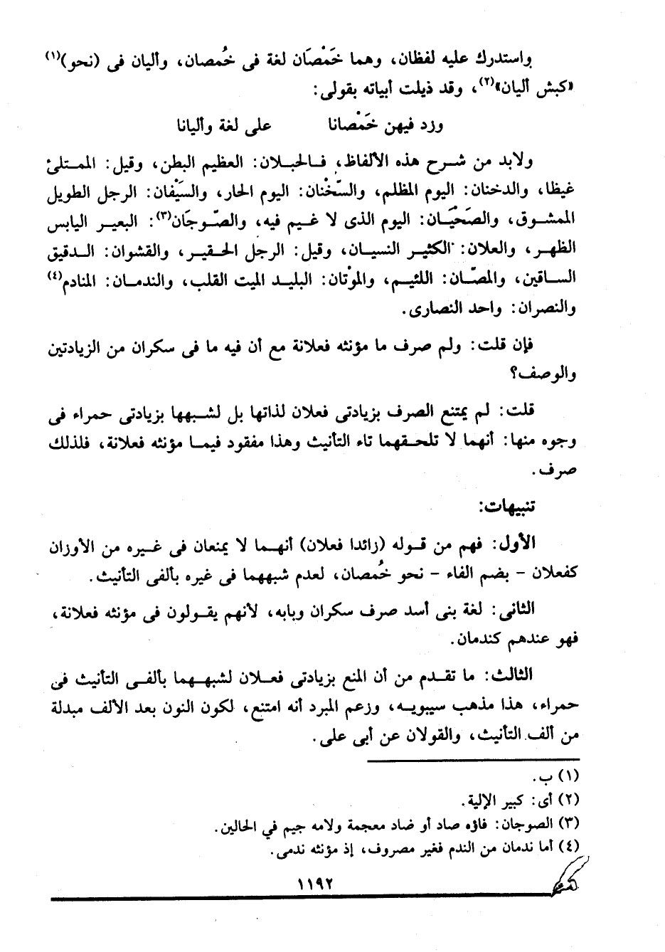 ولا بد من شرح هذه الألفاظ، فالحبلان: العظيم البطن، وقيل: الممتلئ غيظا، والدخنان: اليوم المظلم، والسخنان: اليوم الحار، والسيفان: الرجل الطويل الممشوق، والصحيان: اليوم الذي لا غيم فيه، والصوجان3: البعير اليابس الظهر، والعلان: الكثير النسيان، وقيل: الرجل الحقير، والقشوان: الدقيق الساقين، والمصان: اللئيم، والموتان: البليد الميت القلب، والندمان: المنادم4، والنصران: واحد النصارى.