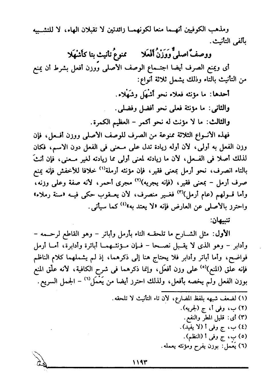 الأول: مثل الشارح ما تلحقه التاء بأرمل وأباتر -وهو القاطع لرحمه- وأدابر -وهو الذي لا يقبل نصحا- فإن مؤنثهما أباترة وأدابرة، أما أرمل فواضح، وأما أباتر وأدابر فلا يحتاج هنا إلى ذكرهما؛ إذ لم يشملهما كلام الناظم فإنه علق "المنع"5 على وزن أفعل، وإنما ذكرهما في شرح الكافية؛ لأنه علق المنع بوزن الفعل ولم يخصه بأفعل؛ ولذلك احترز أيضا من يَعْمَل6 -الجمل السريع.