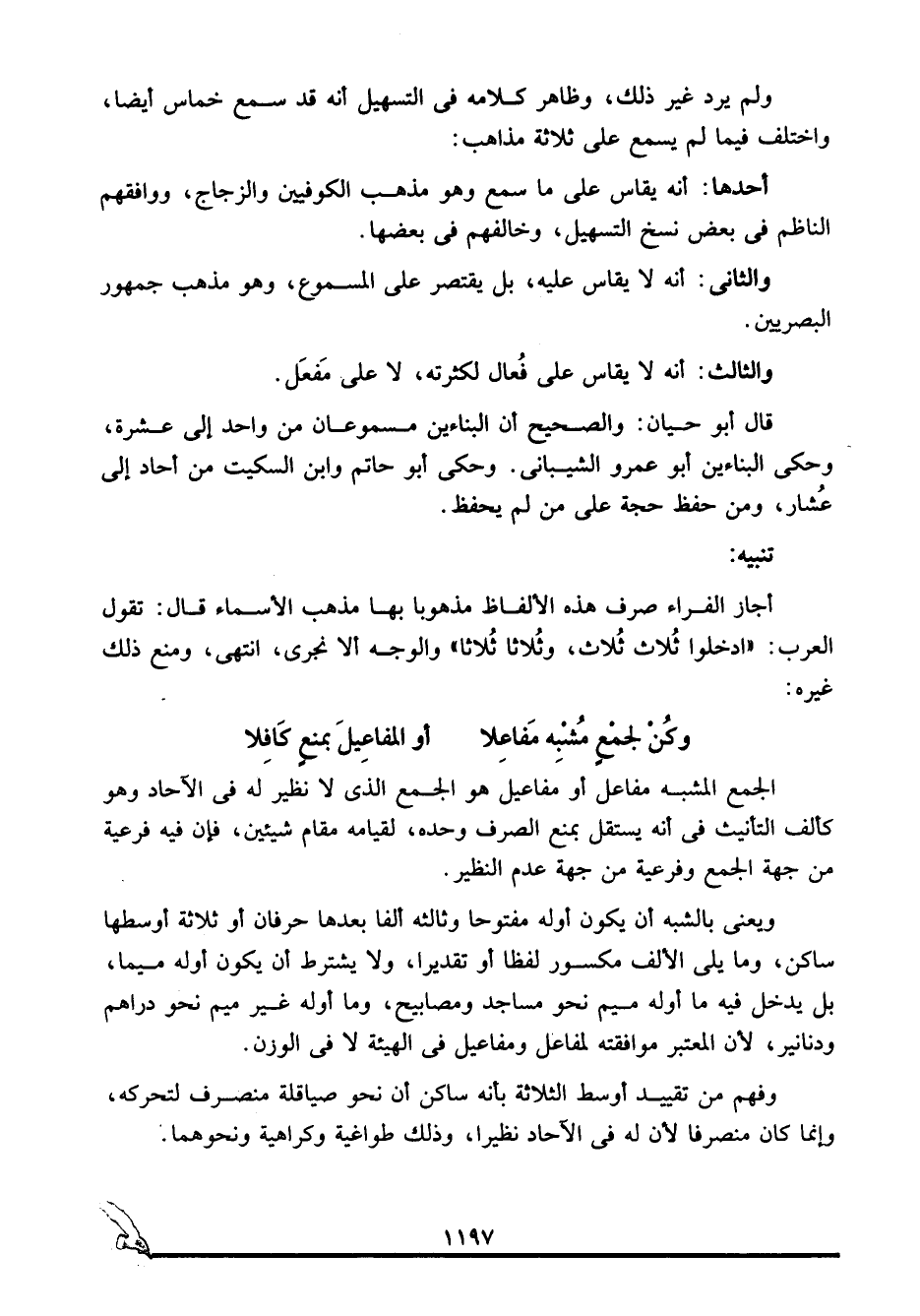 الجمع المشبه مفاعل أو مفاعيل هو الجمع الذي لا نظير له في الآحاد وهو كألف التأنيث في أنه يستقل بمنع الصرف وحده لقيامه مقام شيئين، فإن فيه فرعية من جهة الجمع وفرعية من جهة عدم النظير.