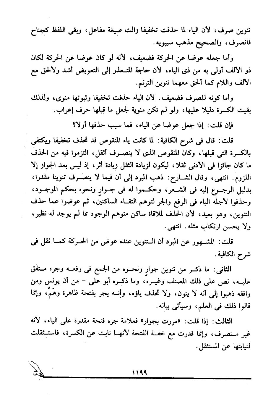 قلت: قال في شرح الكافية: لما كانت ياء المنقوص قد تحذف تخفيفا ويكتفى بالكسرة التي قبلها، وكان المنقوص الذي لا ينصرف أثقل، التزموا فيه من الحذف ما كان جائزا في الأدنى ثقلا؛ ليكون لزيادة الثقل زيادة أثر؛ إذ ليس بعد الجواز إلا اللزوم. انتهى، وقال الشارح: ذهب المبرد إلى أن فيما لا ينصرف تنوينا مقدرا، بدليل الرجوع إليه في الشعر، وحكموا له في جوار ونحوه بحكم الموجود، وحذفوا لأجله الياء في الرفع والجر لتوهم التقاء الساكنين، ثم عوضوا عما حذف التنوين، وهو بعيد؛ لأن الحذف لملاقاة ساكن متوهم الوجود مما لم يوجد له نظير، ولا يحسن ارتكاب مثله. انتهى.