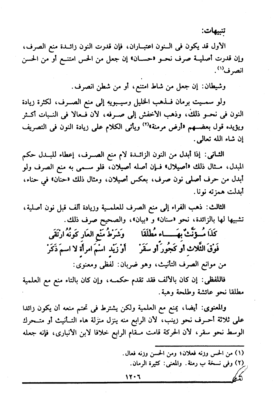 ولو سميت برمان فذهب الخليل وسيبويه إلى منع الصرف؛ لكثرة زيادة النون في نحو ذلك، وذهب الأخفش إلى صرفه؛ لأن فعالا في النبات أكثر، ويؤيده قول بعضهم: "أرض مرمنة"2، ويأتي الكلام على زيادة النون في التصريف إن شاء الله تعالى.