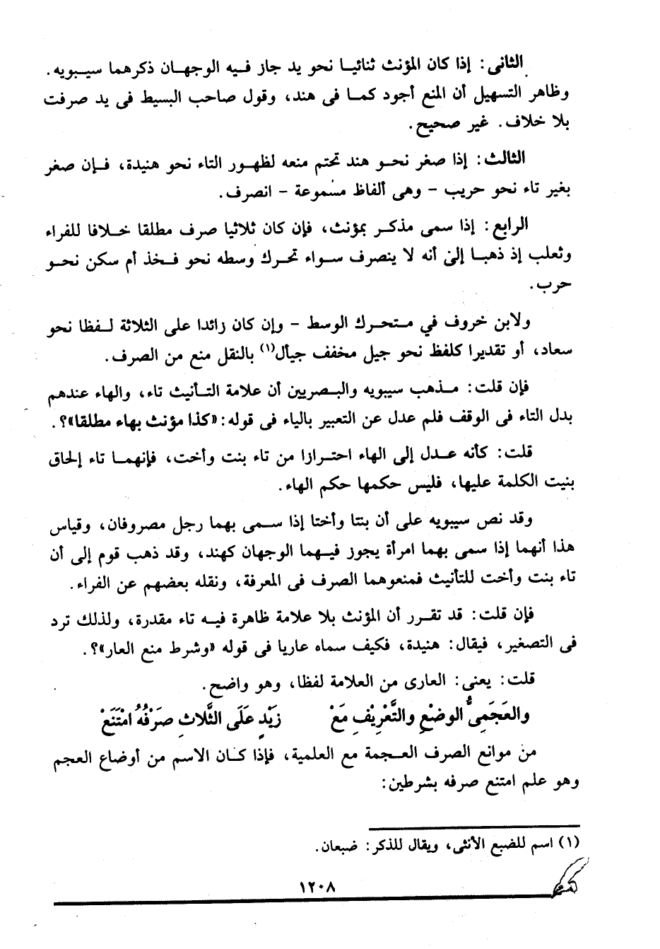 الثالث: إذا صغر نحو هند تحتم منعه لظهور التاء نحو هنيدة، فإن صغر بغير تاء نحو حريب -وهي ألفاظ مسموعة- انصرف.