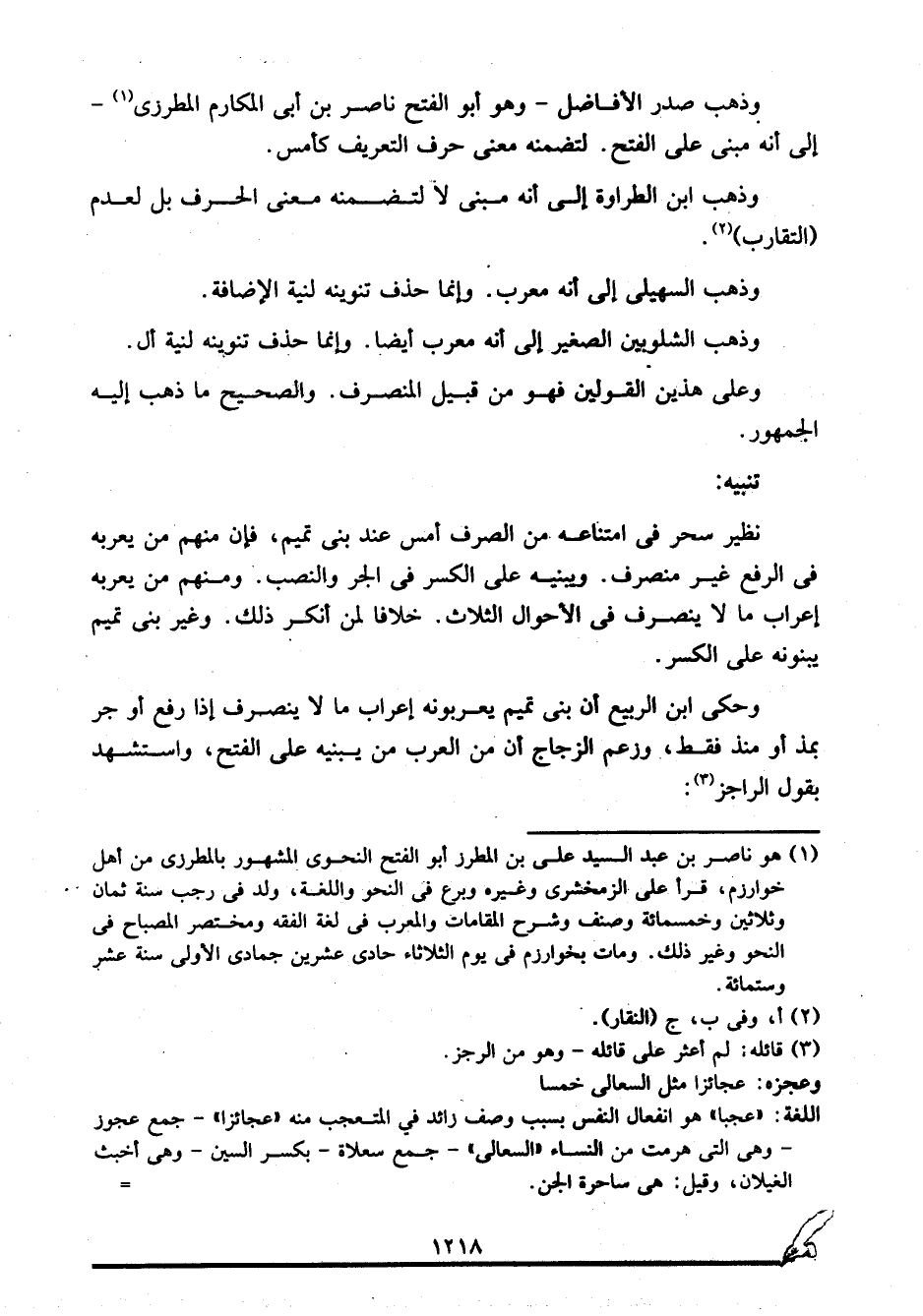 1 هو ناصر بن عبد السيد علي بن المطرز أبو الفتح النحوي المشهور بالمطرزي من أهل خوارزم، قرأ على الزمخشري وغيره وبرع في النحو واللغة، ولد في رجب سنة ثمان وثلاثين وخمسمائة وصنف وشرح المقامات والمعرب في لغة الفقه ومختصر المصباح في النحو وغير ذلك. ومات بخوارزم في يوم الثلاثاء حادي عشرين جمادى الأولى سنة عشر وستمائة.