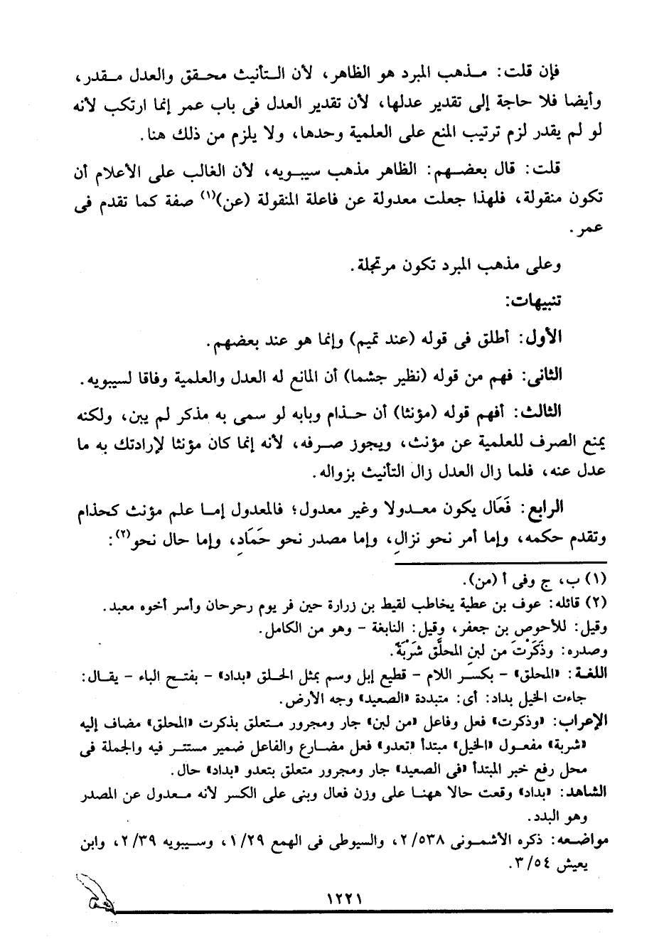 فإن قلت: مذهب المبرد هو الظاهر؛ لأن التأنيث محقق والعدل مقدر، وأيضا فلا حاجة إلى تقدير عدلها؛ لأن تقدير العدل في باب عمر إنما ارتبك لأنه لو لم يقدر لزم ترتيب المنع على العلمية وحدها، ولا يلزم من ذلك هنا.
