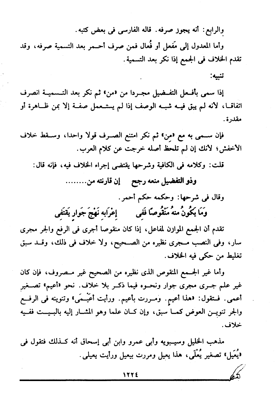 وأما غير الجمع المنقوص الذي نظيره من الصحيح غير مصروف، فإن كان غير علم جرى مجرى جوار ونحوه فيما ذكر بلا خلاف. نحو "أعيم" تصغير أعمى. فتقول: "هذا أعيمٍ. ومررت بأعيمٍ. ورأيت أعيمَى" وتنوينه في الرفع والجر تنوين العوض كما سبق، وإن كان علما وهو المشار إليه بالبيت ففيه خلاف.
