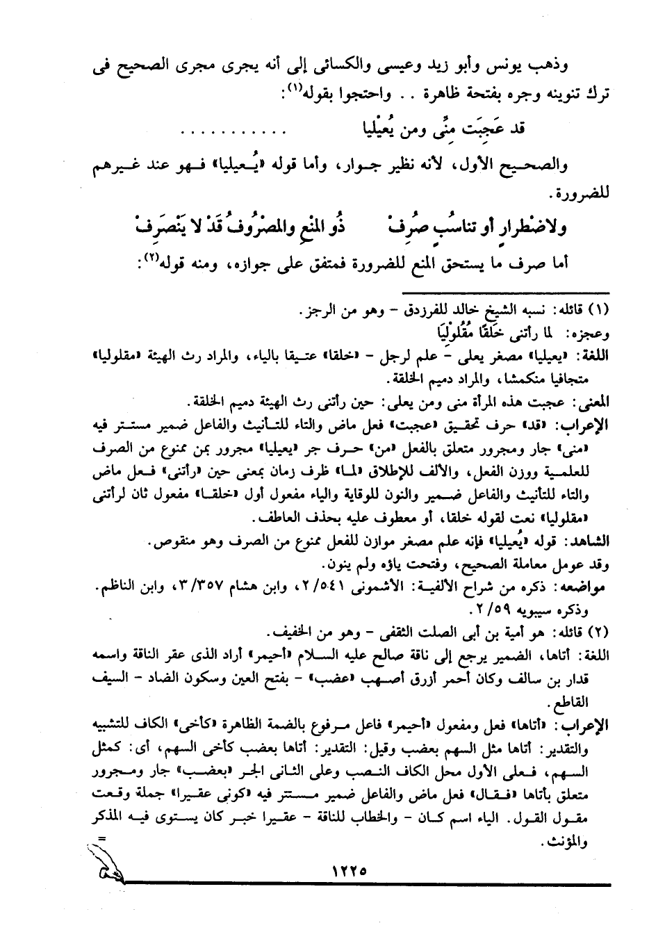 الشاهد: قوله: "يعيليا" فإنه علم مصغر موازن للفعل ممنوع من الصرف وهو منقوص. وقد عومل معاملة الصحيح، وفتحت ياؤه ولم ينون.