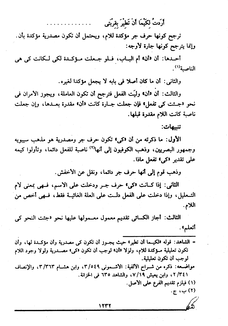 الأول: ما ذكرته من أن "كي" تكون حرف جر ومصدرية هو مذهب سيبويه وجمهور البصريين، وذهب الكوفيون إلى أنها2 ناصبة للفعل دائما، وتأولوا كيمه على تقدير "كي" تفعل ماذا.