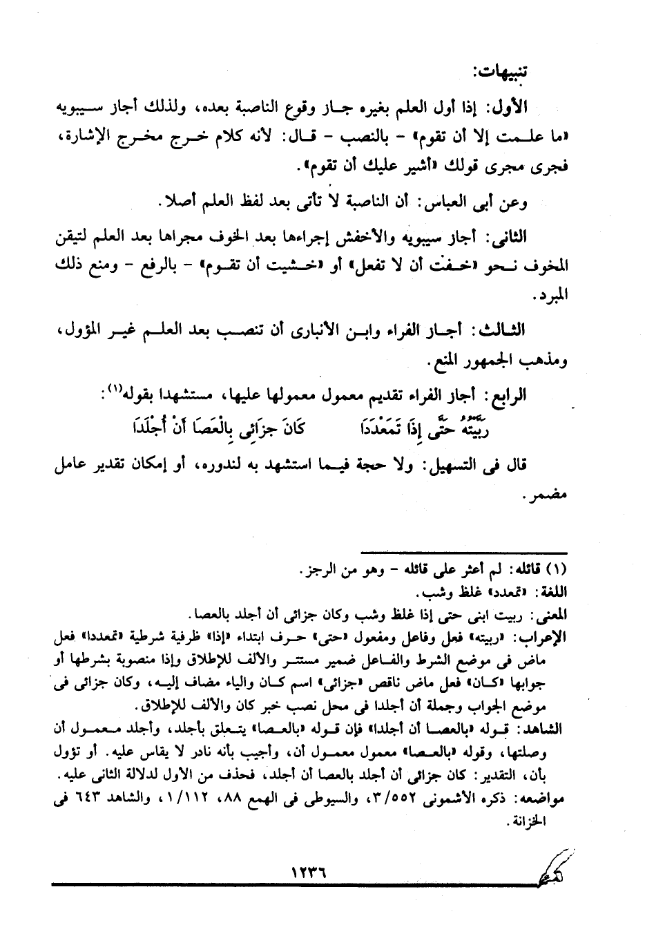الشاهد: قوله: "بالعصا أن أجلدا" فإن قوله "بالعصا" يتعلق بأجلد، وأجلد معمول أن وصلتها، وقوله "بالعصا" معمول معمول أن، وأجب بأنه نادر لا يقاس عليه، أو تؤول بأن، التقدير: كان جزائي أن أجلد بالعصا أن أجلد، فحذف من الأول لدلالة الثاني عليه.