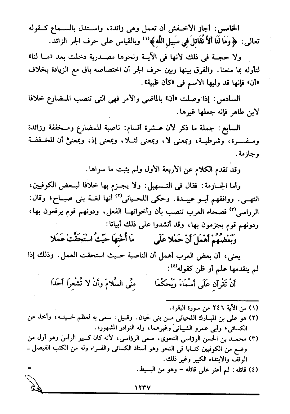 الخامس: أجاز الأخفش أن تعمل وهي زائدة، واستدل بالسماع كقوله تعالى: {وَمَا لَنَا أَلَّا نُقَاتِلَ فِي سَبِيلِ اللَّهِ} 1 وبالقياس على حرف الجر الزائد.
