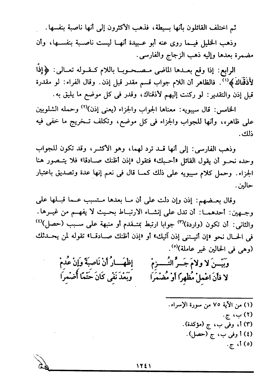 الرابع: إذا وقع بعدها الماضي مصحوبا باللام كقوله تعالى: {إِذًا لَأَذَقْنَاكَ} 1. فالظاهر أن اللام جواب قسم مقدر قبل إذن. وقال افراء: لو مقدرة قبل إذن. والتقدير: لو ركنت إليهم لأذقناك، وقدر في كل موضع ما يليق به.