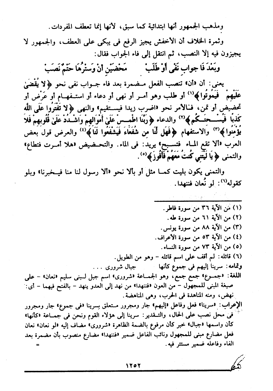 يعني: أن "أن" تنصب الفعل مضمرة بعد فاء جواب نفي نحو: {لَا يُقْضَى عَلَيْهِمْ فَيَمُوتُوا} 1 أو طلب وهو أمر أو نهي أو دعاء أو استفهام أو عرض أو تحضيض أو تمن، فالأمر نحو: "اضرب زيدا فيستقيم" والنهي: {لَا تَفْتَرُوا عَلَى اللَّهِ كَذِبًا فَيُسْحِتَكُمْ} 2 والدعاء: {رَبَّنَا اطْمِسْ عَلَى أَمْوَالِهِمْ وَاشْدُدْ عَلَى قُلُوبِهِمْ فَلَا يُؤْمِنُوا} 3 والاستفهام: {فَهَلْ لَنَا مِنْ شُفَعَاءَ فَيَشْفَعُوا لَنَا} 4 والعرض قول بعض العرب: "ألا تقع الماء فتسبح" يريد: في الماء. والتحضيض: "هلا أمرت فتطاع" والتمني: {يَا لَيْتَنِي كُنْتُ مَعَهُمْ فَأَفُوزَ} 5.