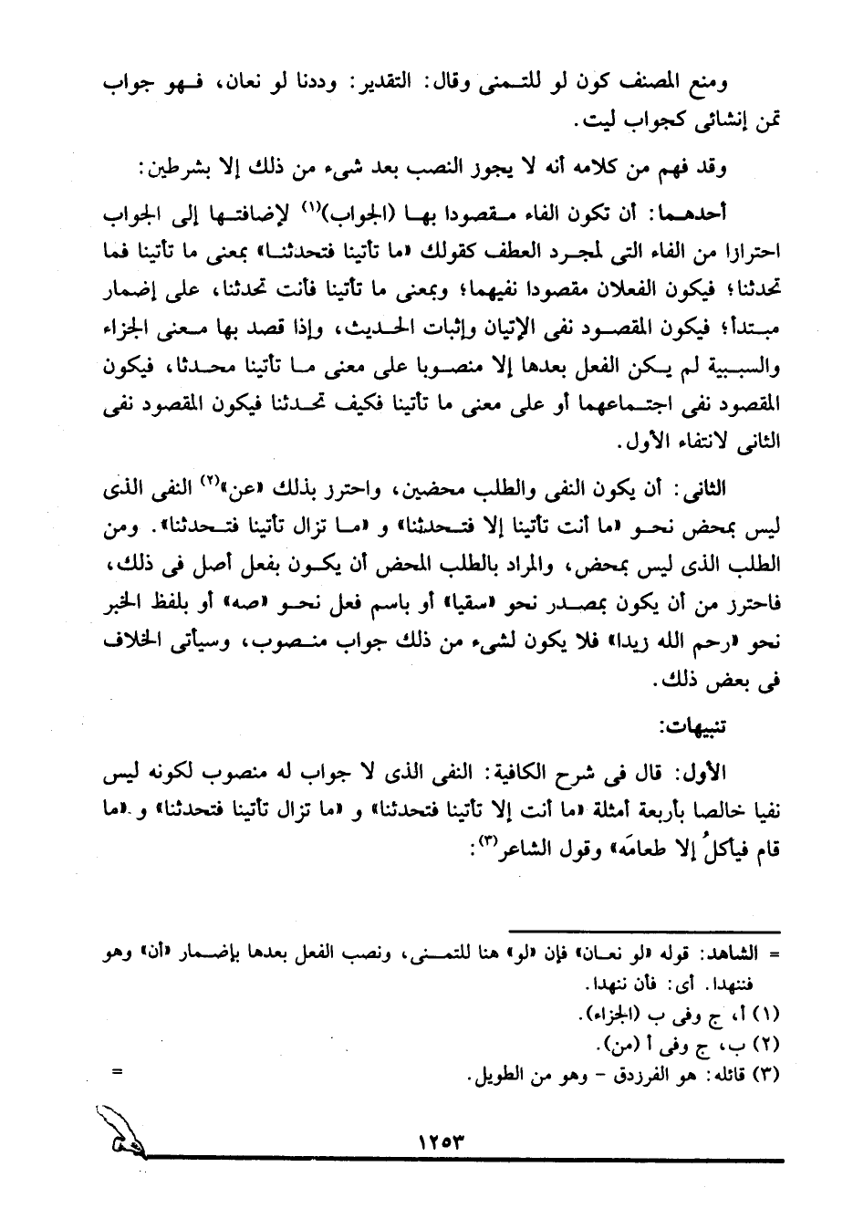 الأول: قال في شرح الكافية: النفي الذي لا جواب له منصوب لكونه ليس نفيا خالصا بأربعة أمثلة: "ما أنت إلا تأتينا فتحدثنا" و"ما تزال تأتينا فتحدثنا" و"ما قام فيأكل إلا طعامه" وقول الشاعر3: