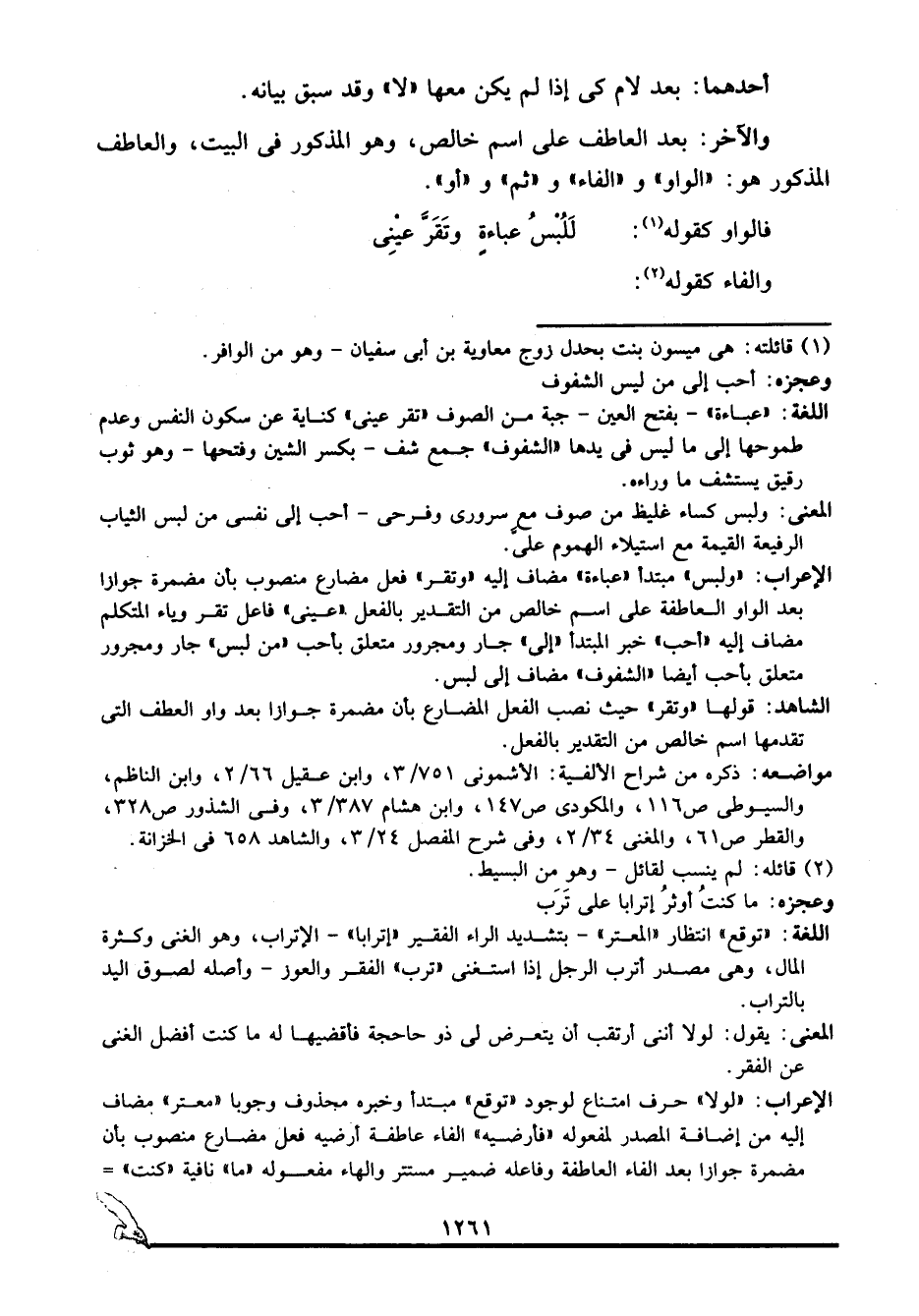 الإعراب: "ولبس" مبتدأ "عباءة" مضاف إليه "وتقر" فعل مضارع منصوب بأن مضمرة جوازا بعد الواو العاطفة على اسم خالص من التقدير بالفعل "عيني" فاعل تقر وياء المتكلم مضاف إليه "أحب" خبر المبتدأ "إلي" جار ومجرور متعلق بأحب "من لبس" جار ومجرور متعلق بأحب أيضا "الشفوف" مضاف إلى لبس.