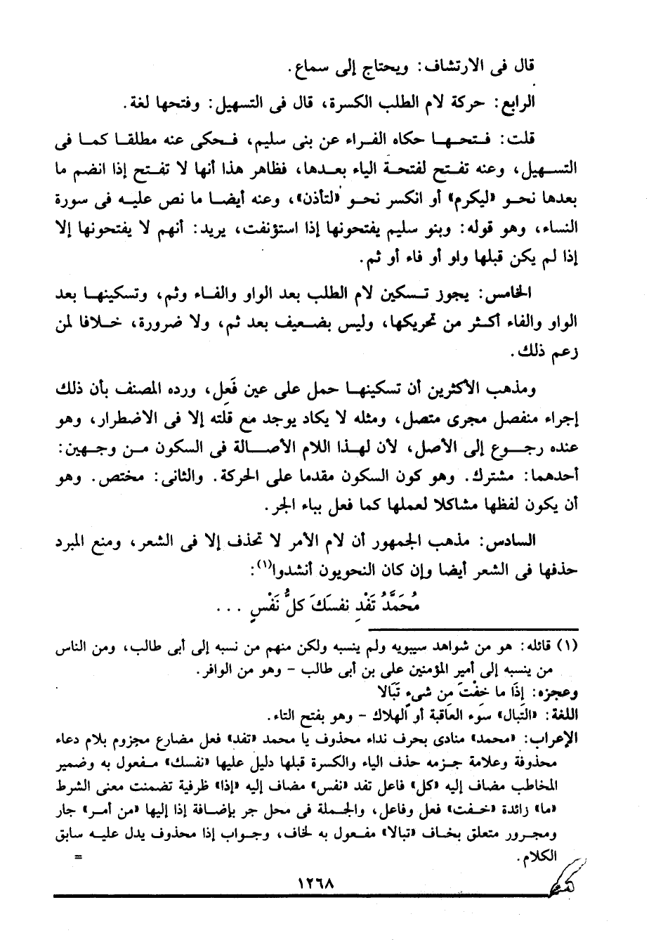 الإعراب: "محمد" منادى بحرف نداء محذوف يا محمد "تفد" فعل مضارع مجزوم بلام دعاء محذوفة وعلامة جزمه حذف الياء والكسرة قبلها دليل عليها "نفسك" مفعول به وضمير المخاطب مضاف إليه "كل" فاعل تفد "نفس" مضاف إليه "إذا" ظرفية تضمنت معنى الشرط "ما" زائدة "خفت" فعل وفاعل، والجملة في محل جر بإضافة إذا إليها "من أمر" جار ومجرور متعلق بخاف "تبالا" مفعول به لخاف، وجواب إذا محذوف يدل عليه سابق الكلام.