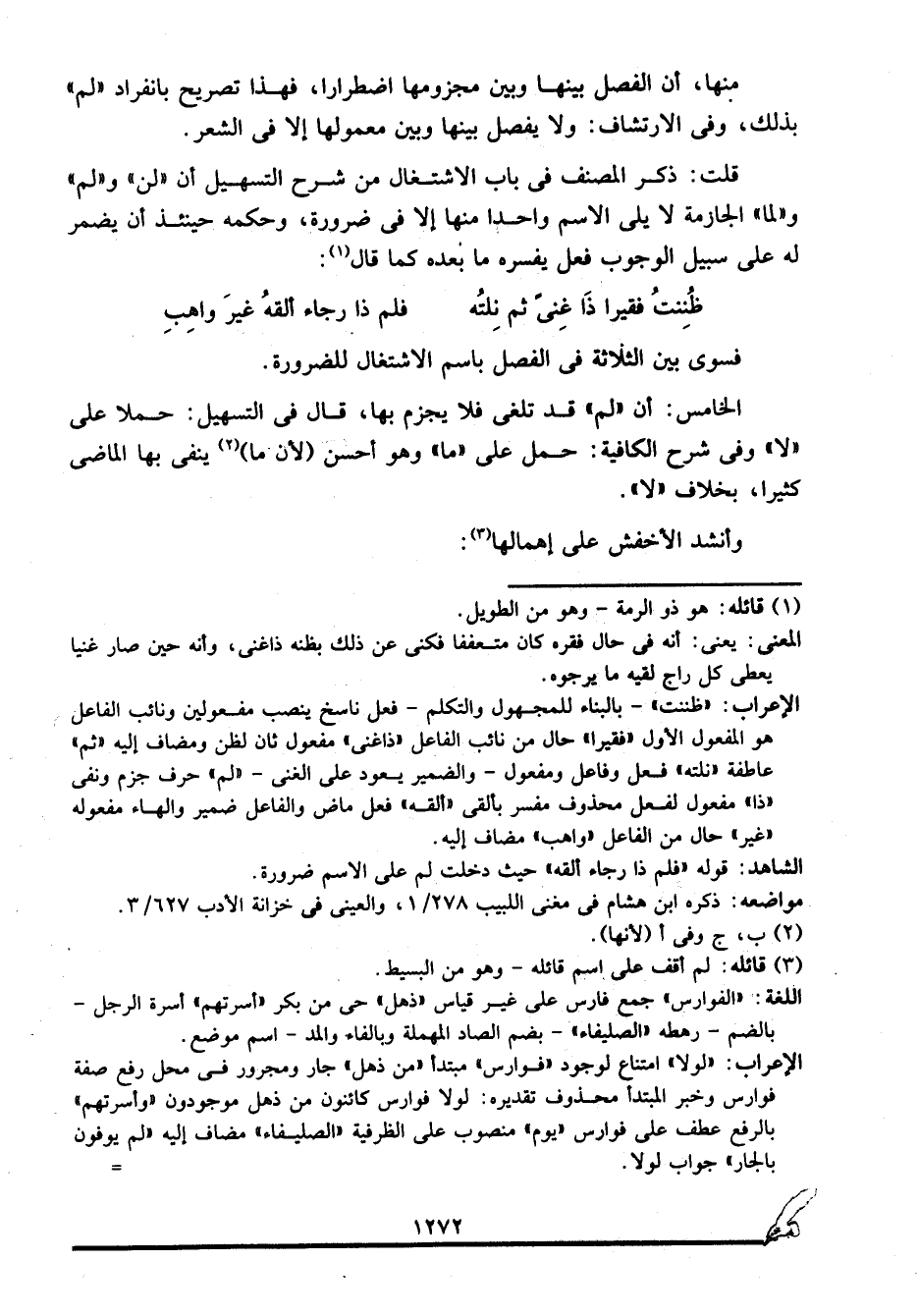 الإعراب: "ظننت" -بالبناء للمجهول والتكلم- فعل ناسخ ينصب مفعولين ونائب الفاعل هو المفعول الأول "فقيرا" حال من نائب الفاعل "ذا غنى" مفعول ثان لظن ومضاف إليه "ثم" عاطفة "نلته" فعل وفاعل ومفعول -والضمير يعود على الغنى- "لم" حرف جزم ونفي "ذا" مفعول لفعل محذوف مفسر بألقى "ألقه" فعل ماض والفاعل ضمير والهاء مفعوله "غير" حال من الفاعل "واهب" مضاف إليه.