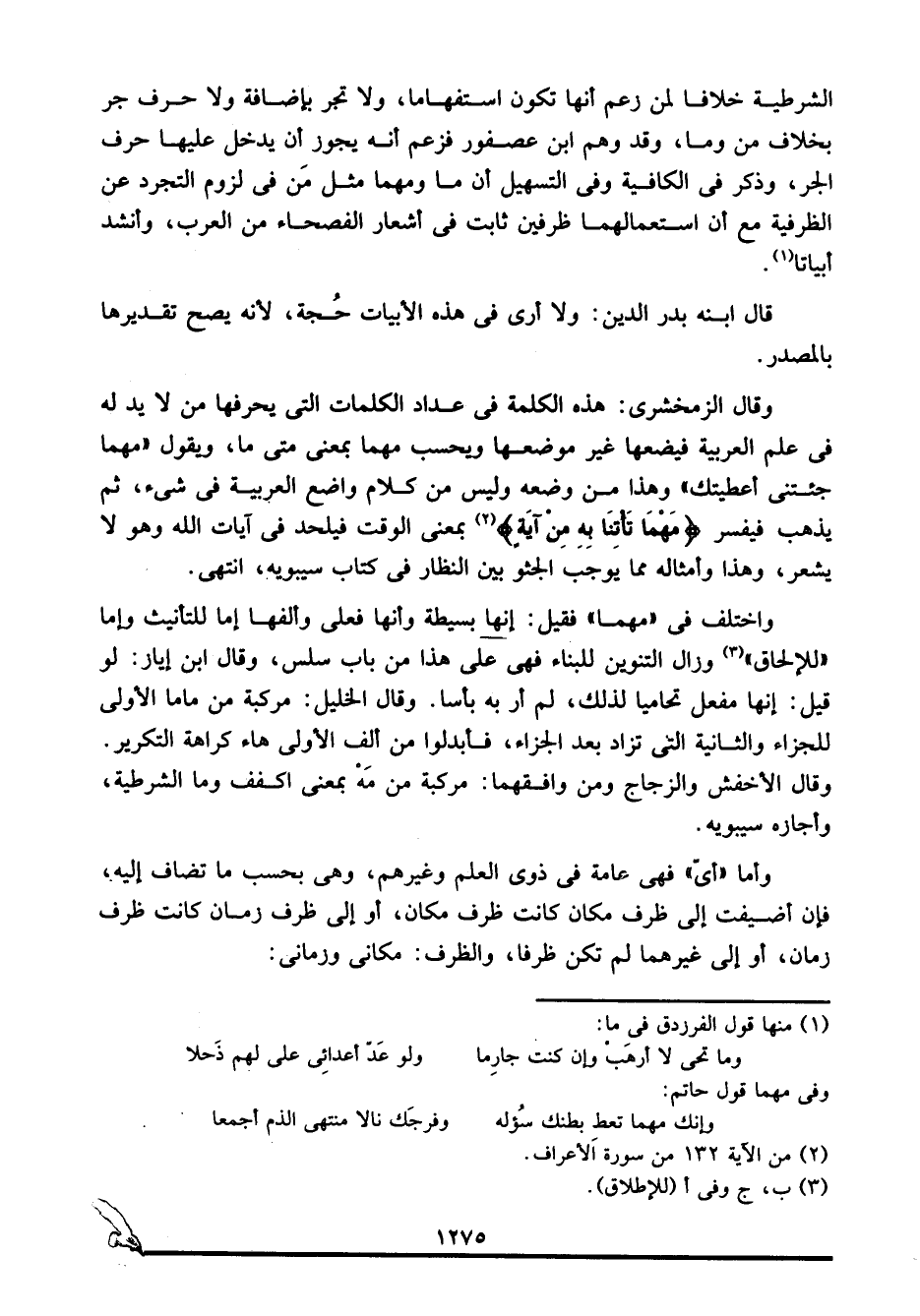 الشرطية خلافا لمن زعم أنها تكون استفهاما، ولا تجر بإضافة ولا حرف جر بخلاف من وما، وقد وهم ابن عصفور فزعم أنه يجوز أن يدخل عليها حرف الجر، وذكر في الكافية وفي التسهيل أن ما ومهما مثل من في لزوم التجرد عن الظرفية مع أن استعمالهما ظرفين ثابت في أشعار الفصحاء من العرب، وأنشد أبياتا1.