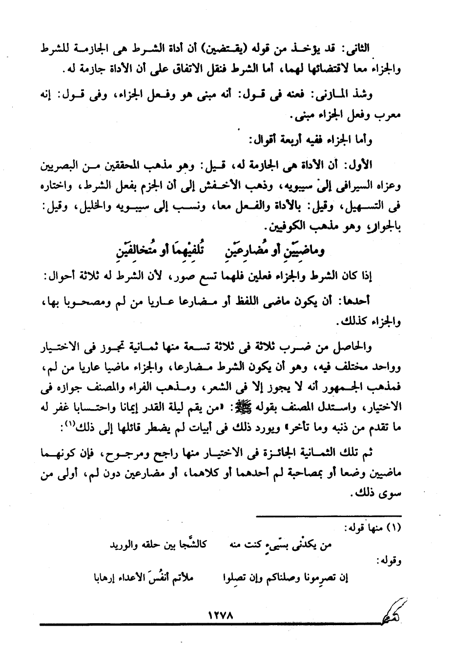 والحاصل من ضرب ثلاثة في ثلاثة تسعة منها ثمانية تجوز في الاختيار وواحد مختلفين فيه، وهو أن يكون الشرط مضارعا، والجزاء ماضيا عاريا من لم، فمذهب الجمهور أنه لا يجوز إلا في الشعر، ومذهب الفراء والمصنف جوازه في الاختيار، واستدل المصنف بقوله صلى الله عليه وسلم: "من يقم ليلة القدر إيمانا واحتسابا غفر له ما تقدم من ذنبه وما تأخر"، ويورد ذلك في أبيات لم يضطر قائلها إلى ذلك1.
