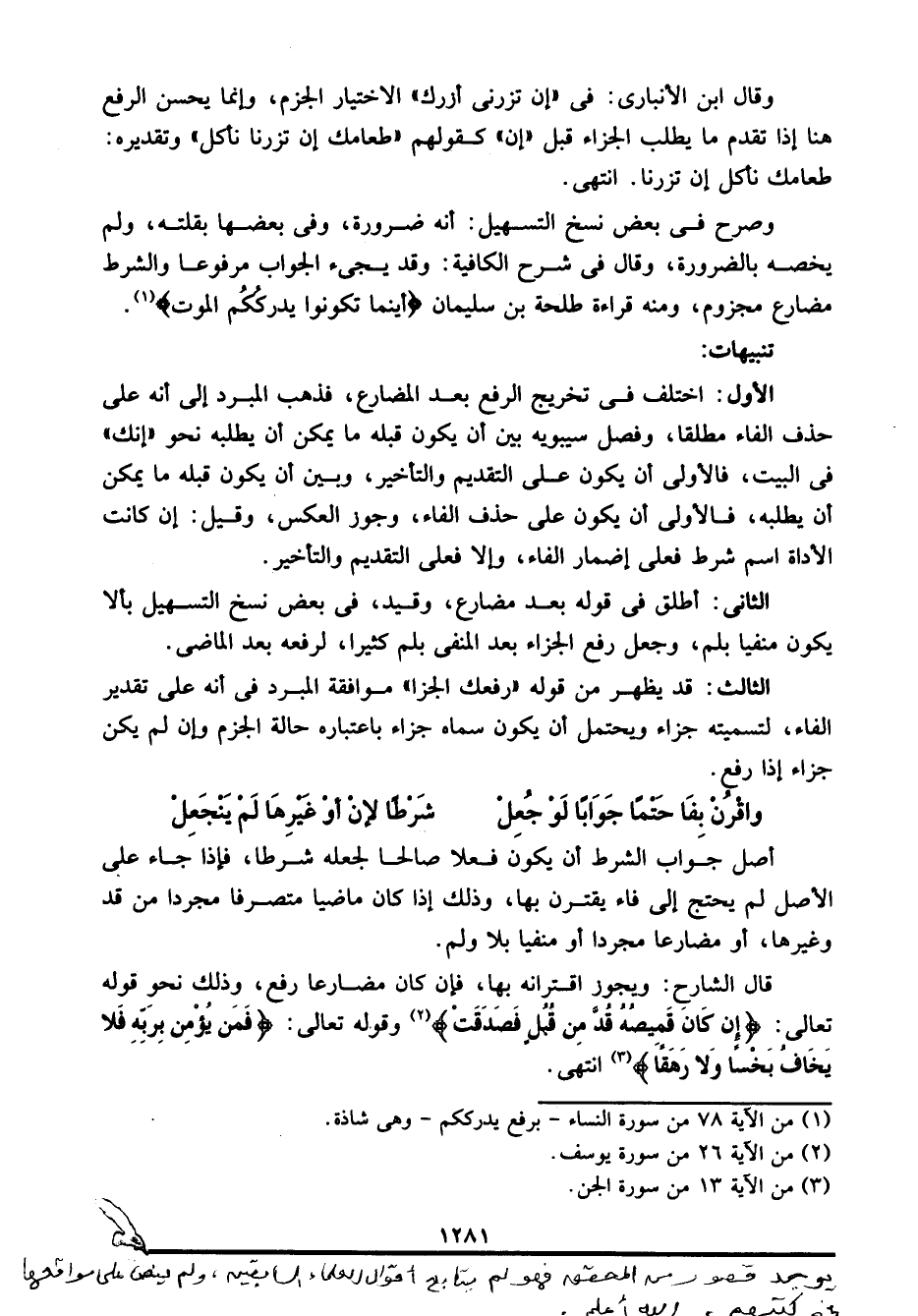 الثالث: قد يظهر من قوله: "رفعك الجزا" موافقة المبرد في أنه على تقدير الفاء لتسميته جزاء، ويحتمل أن يكون سماه جزاء باعتباره حالة الجزم وإن لم يكن جزاء إذا رفع.