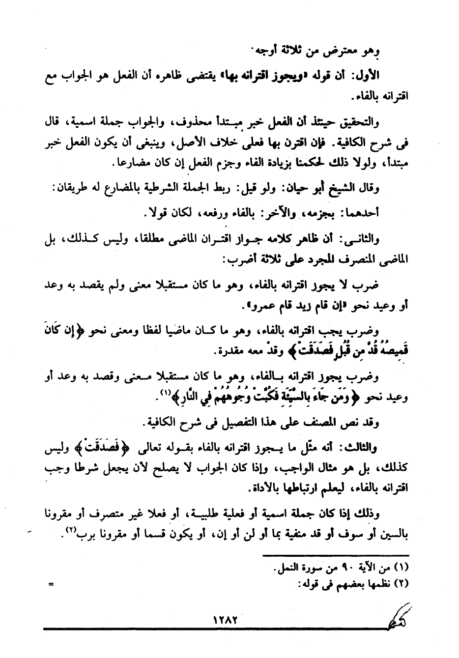 والثالث: أنه مثل ما يجوز اقترانه بالفاء بقوله تعالى: {فَصَدَقَتْ} وليس كذلك، بل هو مثال الواجب، وإذا كان الجواب لا يصلح لأن يجعل شرطا وجب اقترانه بالفاء؛ ليعلم ارتباطها بالأداة.