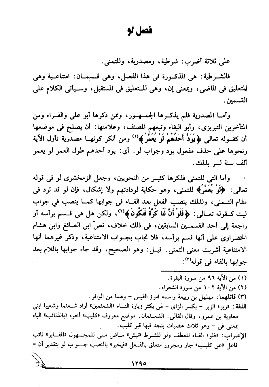 وأما التي للتمني: فذكرها كثير من النحويين، وجعل الزمخشري لو في قوله تعالى: {لَوْ يُعَمَّرُ} للتمني، وهو حكاية لودادتهم ولا إشكال، فإن لو قد ترد في مقام التمني؛ ولذلك ينصب الفعل بعد الفاء في جوابها كما ينصب في جواب ليت كقوله تعالى: {فَلَوْ أَنَّ لَنَا كَرَّةً فَنَكُونَ} 2، ولكن هل هي قسم برأسه أو راجعة إلى أحد القسمين السابقين، في ذلك خلاف، نص ابن الصائغ وابن هشام الخضراوي على أنها قسم برأسه، فلا تجاب بجواب الامتناعية، وذكر غيرهما أنها الامتناعية أشربت معنى التمني. قيل: وهو الصحيح، وقد جاء جوابها باللام بعد جوابها بالفاء في قوله3: