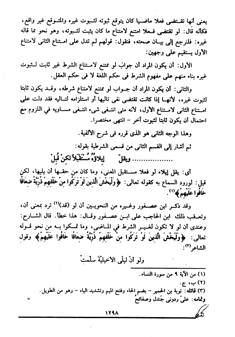 والثاني: أن يكون المراد أن جواب لو ممتنع لامتناع شرطه، وقد يكون ثابتا لثبوت غيره؛ لأنها إذا كانت تقتضي نفي تاليها أو استلزامه لتاليه فقد دلت على امتناع الثاني لامتناع الأول؛ لأنه متى انتفى شيء انتفى مساويه في اللزوم مع احتمال أن يكون ثابتا لثبوت آخر. انتهى مختصرا.