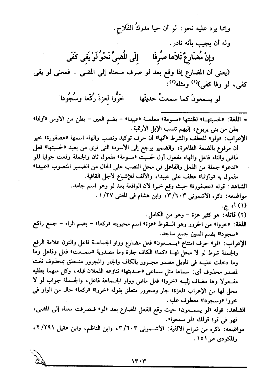 الإعراب: "لو" حرف امتناع "يسمعون" فعل مضارع وواو الجماعة فاعل والنون علامة الرفع والجملة شرط لولا محل لها "كما" الكاف جارة وما مصدرية "سمعت" فعل وفاعل وما وما دخلت عليه في تأويل مصدر مجرور بالكاف والجار والمجرور متعلق بمحذوف نعت لمصدر محذوف أي: سماعا مثل سماعي "حديثها" تنازعه الفعلان قبله، وكل منهما يطلبه مفعولا وها مضاف إليه "خروا" فعل ماض وواو الجماعة فاعل، والجملة جواب لولا محل لها من الإعراب "لعزة" جار ومجرور متعلق بقوله: خروا "ركعا" حال من الواو في خروا "وسجودا" معطوف عليه.