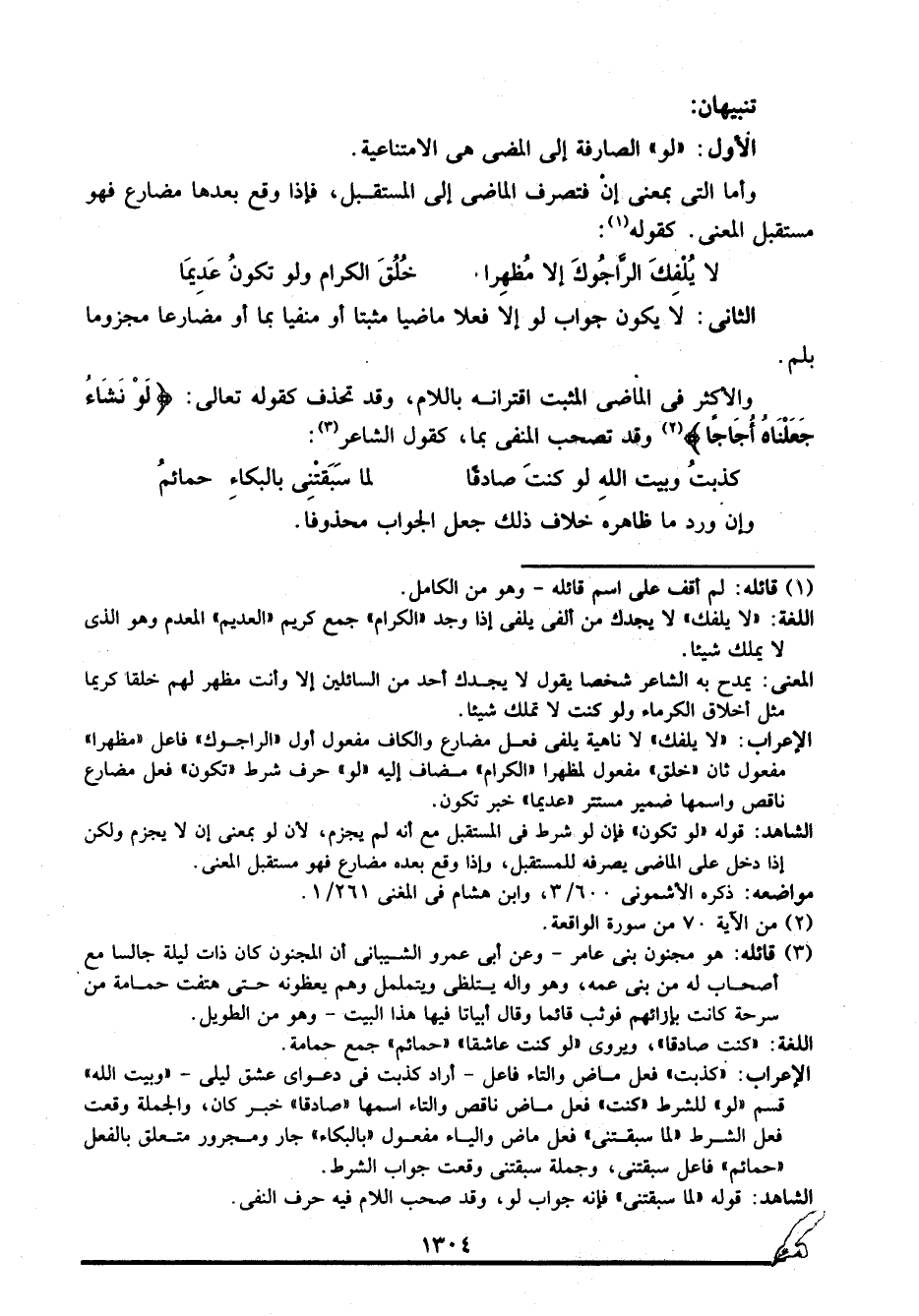 والأكثر في الماضي المثبت اقترانه باللام، وقد تحذف كقوله تعالى: {لَوْ نَشَاءُ جَعَلْنَاهُ أُجَاجًا} 2 وقد تصحب المنفي بما، كقول الشاعر3: