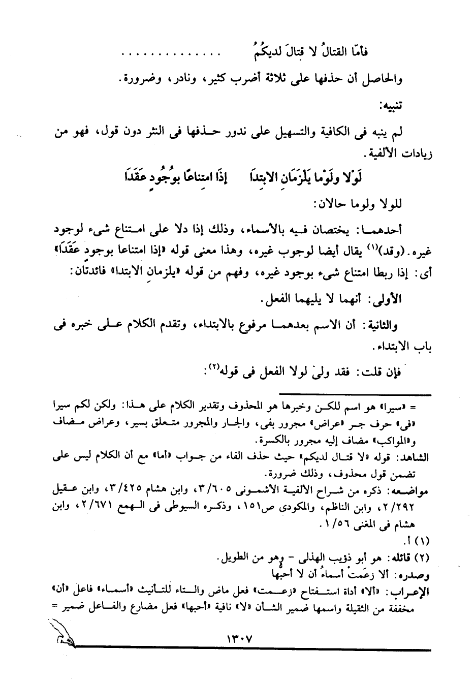 لم ينبه في الكافية والتسهيل على ندور حذفها في النثر دون قول، فهو من زيادات الألفية: