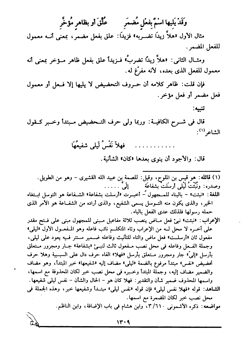 الإعراب: "نبئت" نبئ فعل ماض ينصب ثلاثة مفاعيل مبني للمجهول مبني على فتح مقدر على آخره لا محل له من الإعراب وتاء المتكلم نائب فاعله وهو المفعول الأول "ليلى" مفعول ثان "أرسلت" فعل ماض والتاء للتأنيث وفاعله ضمير مستتر فيه يعود على ليلى، وجملة الفعل وفاعله في محل نصب مفعول ثالث لنبئ "بشفاعة" جار ومجرور متعلق بأرسل "إليَّ" جار ومجرور متعلق بأرسل "فهلا" الفاء حرف دال على السببية وهلا حرف تحضيض "نفس" مبتدأ مرفوع بالضمة "ليلى" مضاف إليه "شفيعها" خبر المبتدأ، وهو مضاف والضمير مضاف إليه، وجملة المبتدأ وخبره في محل نصب خبر لكان المحذوفة مع اسمها، واسمها المحذوف ضمير شأن، والتقدير: فهلا كان هو -الحال والشأن- نفس ليلى شفيعها.