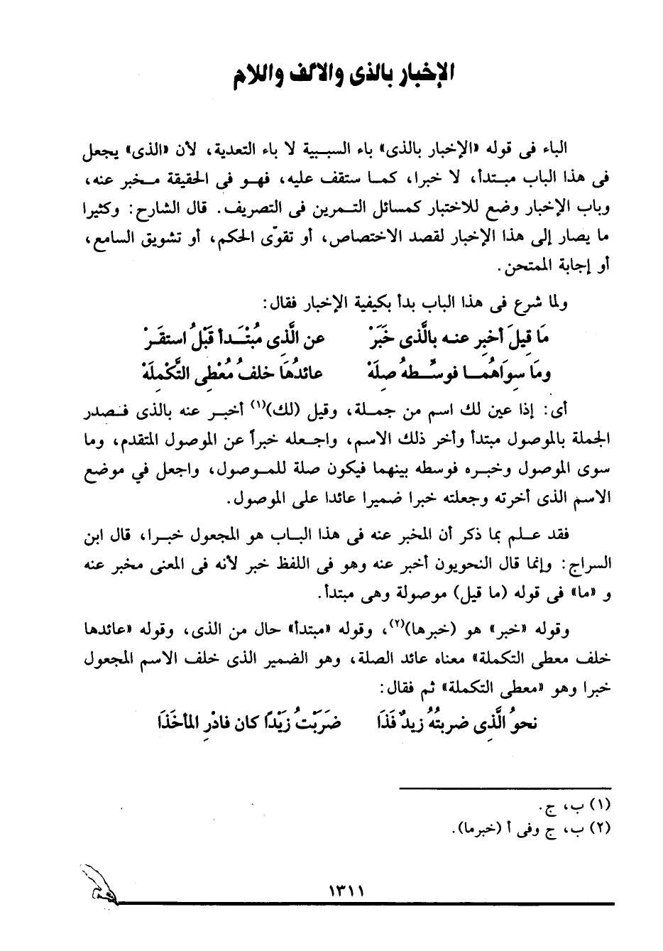 الباء في قوله: "الإخبار بالذي" باء السببية لا باء التعدية؛ لأن "الذي" يجعل في هذا الباب مبتدأ، لا خبرا، كما ستقف عليه، فهو في الحقيقة مخبر عنه، وباب الإخبار وضع للاختبار كمسائل التمرين في التصريف. قال الشارح: وكثيرا ما يصار إلى هذا الإخبار لقصد الاختصاص، أو تقوي الحكم، أو تشويق السامع، أو إجابة الممتحن.