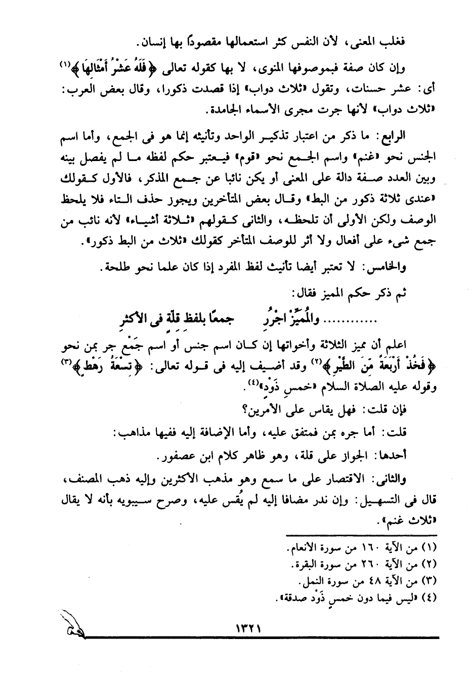 الرابع: ما ذكر من اعتبار تذكير الواحد وتأنيثه إنما هو في الجمع، وأما اسم الجنس نحو "غنم" واسم الجمع نحو "قوم" فيعتبر حكم لفظه ما لم يفصل بينه وبين العدد صفة دالة على المعنى أو يكن نائبا عن جمع المذكر، فالأول كقولك: "عندي ثلاثة ذكور من البط" وقال بعض المتأخرين: ويجوز حذفه التاء فلا يلحظ الوصف ولكن الأولى أن تلحظه، والثاني كقولهم: "ثلاثة أشياء" لأنه نائب من جمع شيء على أفعال، ولا أثر للوصف المتأخر كقولك: "ثلاث من البط ذكور".