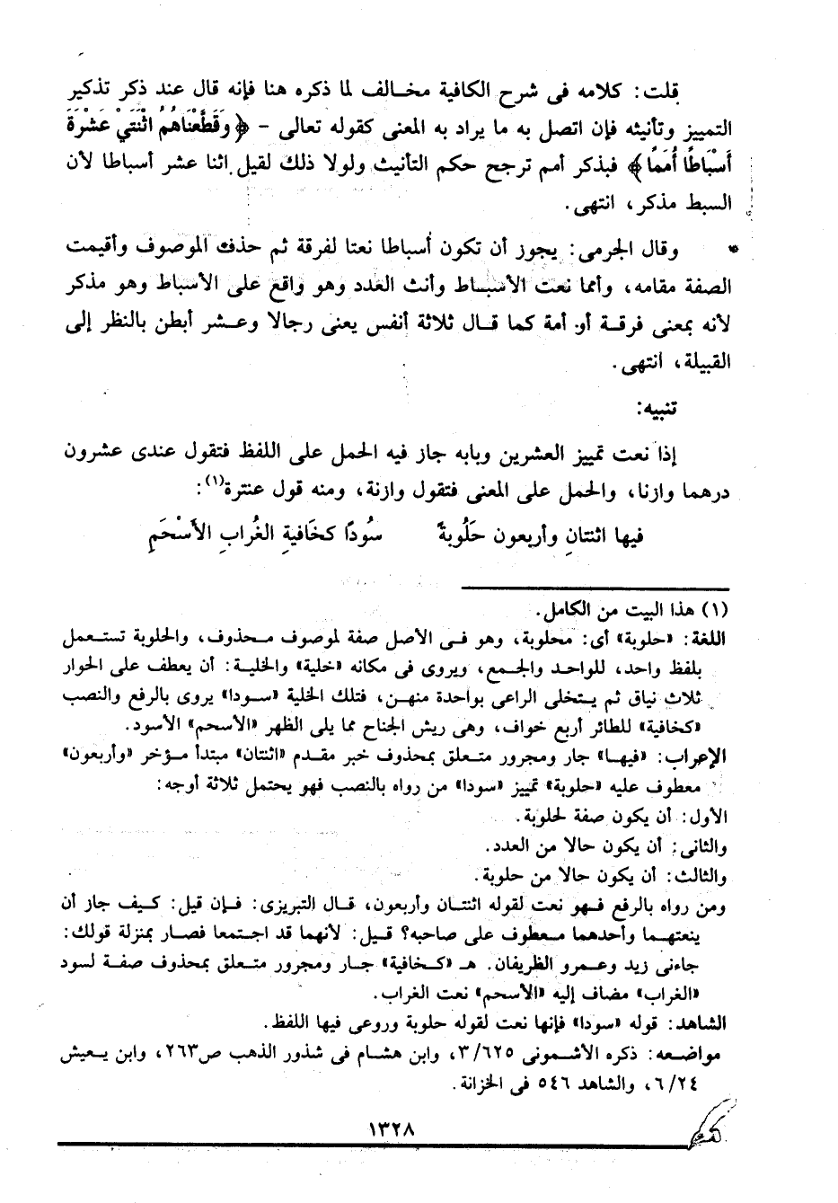 ومن رواه بالرفع فهو نعت لقوله: اثنتان وأربعون، قال التبريزي: فإن قيل: كيف جاز أن ينعتهما أحدهما معطوف على صاحبه؟ قيل: لأنهما قد اجتمعا فصار بمنزلة قولك: جاءني زيد وعمرو الظريفان. اهـ. "كخافية" جار ومجرور متعلق بمحذوف صفة لسود "الغراب" مضاف إليه "الأسحم" نعت الغراب.