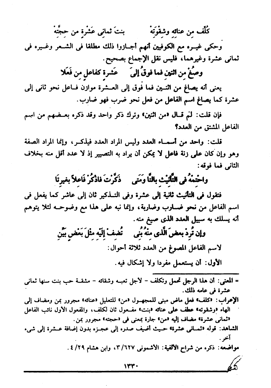 الإعراب: "كلف" فعل ماض مبني للمجهول "من" للتعليل "عنائه" مجرور بمن ومضاف إلى الهاء "وشقوته" عطف على عنائه "بنت" مفعول ثان لكلف، والمفعول الأول نائب الفاعل "ثماني عشرة" مضاف إليه "من" جارة بمعنى في "حجته" مجرور بمن.
