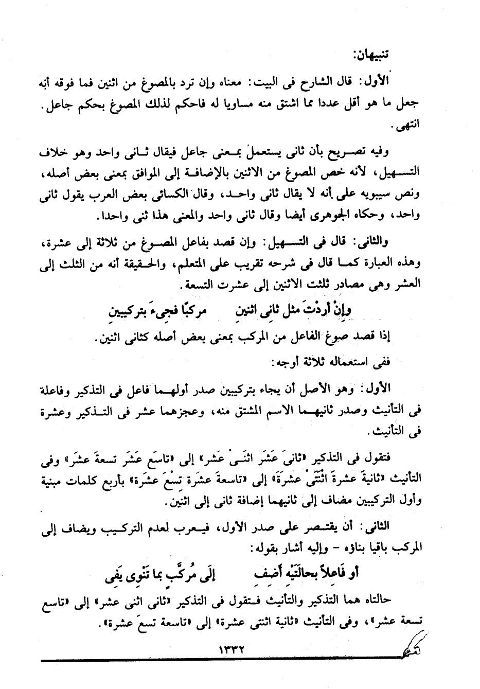 الأول: قال الشارح في البيت: معناه وإن ترد بالمصوغ من اثنين فما فوقه أنه جعل ما هو أقل عددا مما اشتق منه مساويا له فاحكم لذلك المصوغ بحكم جاعل. انتهى.