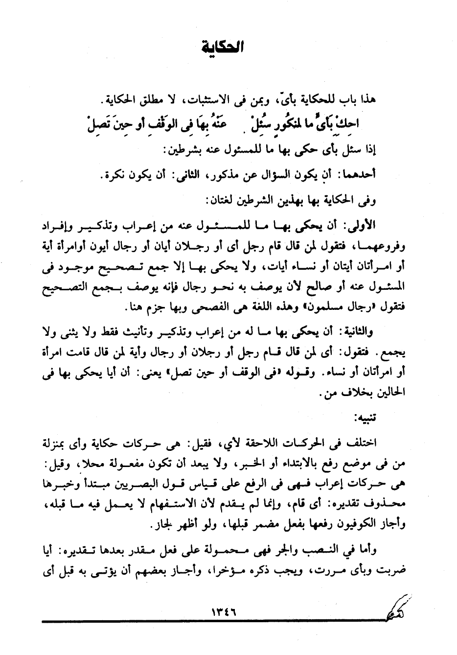 الأولى: أن يحكى بها ما للمسئول عنه من إعراب وتذكير وإفراد وفروعهما، فتقول لمن قال: قام رجل أي أو رجلان أيان أو رجلا أيون أو امرأة أية أو امرأتان أيتان أو نساء أيات، ولا يحكى بها إلا جمع تصحيح موجود في المسئول عنه أو صالح لأن يوصف به نحو رجال، فإنه يوصف بجمع التصحيح فتقول: "رجال مسلمون"، وهذه اللغة هي الفصحى وبها جزم هنا.