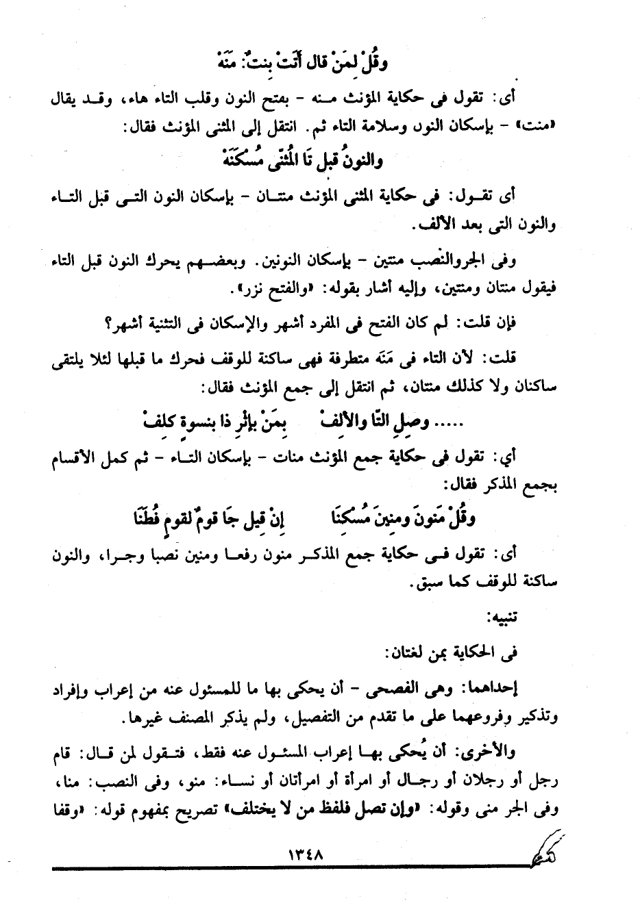 قلت: لأن التاء في مَنَه متطرفة فهي ساكنة للوقف فحرك ما قبلها لئلا يلتقي ساكنان ولا كذلك منتان، ثم انتقل إلى جمع المؤنث فقال: