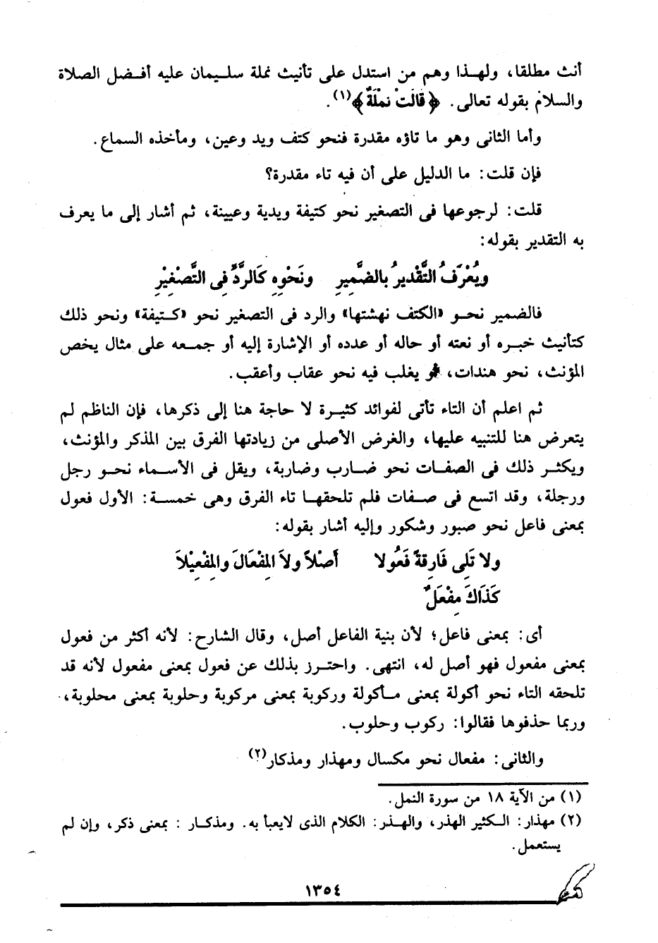 ثم اعلم أن التاء تأتي لفوائد كثيرة لا حاجة هنا إلى ذكرها، فإن الناظم لم يتعرض هنا لتنبيه عليها، والغرض الأصلي من زيادتها الفرق بين المذكر والمؤنث، ويكثر ذلك في الصفات نحو: ضارب وضاربة، ويقل في الأسماء نحو: رجل ورجلة، وقد اتسع في صفات فلم تلحقها تاء الفرق وهي خمسة: