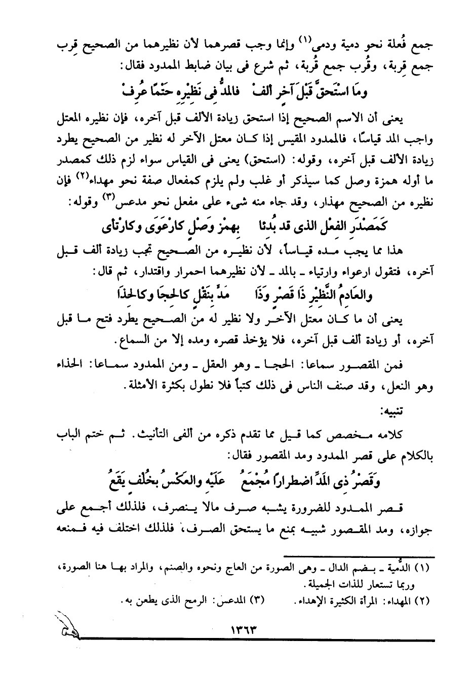 جمع فُعلة نحو: دمية ودمى1، وإنما وجب قصرهما لأن نظيرهما من الصحيح قِرب جمع قِربة، وقُرب جمع قُربة، ثم شرع في بيان ضابط الممدود فقال: