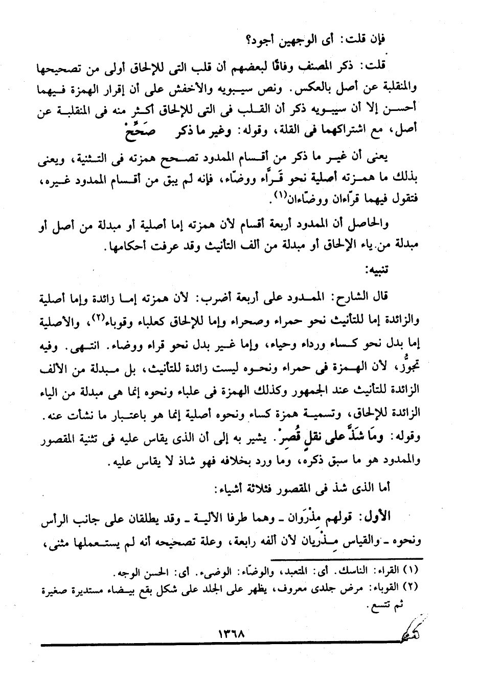 قال الشارح: الممدود على أربعة أضرب؛ لأن همزته إما زائدة وإما أصلية، والزائدة إما للتأنيث نحو حمراء وصحراء وإما للإلحاق كعلباء وقوباء2، والأصلية إما بدل نحو كساء ورداء وحياء، وإما غير بدل نحو قراء ووضاء. انتهى. وفيه تجوُّز؛ لأن الهمزة في حمراء ونحوه ليست زائدة للتأنيث، بل مبدلة من الألف الزائدة للتأنيث عند الجمهور، وكذلك الهمزة في علباء ونحوه إنما هي مبدلة من الياء الزائدة للإلحاق، وتسمية همزة كساء ونحوه أصلية إنما هو باعتبار ما نشأت عنه. وقوله: