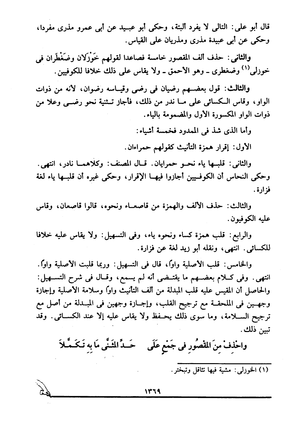 والثاني: حذف ألف المقصور خامسة فصاعدا لقولهم: خَوْزَلان وضَغْطَران في خوزلي1 وضغطري -وهو الأحمق- ولا يقاس على ذلك خلافا للكوفيين.